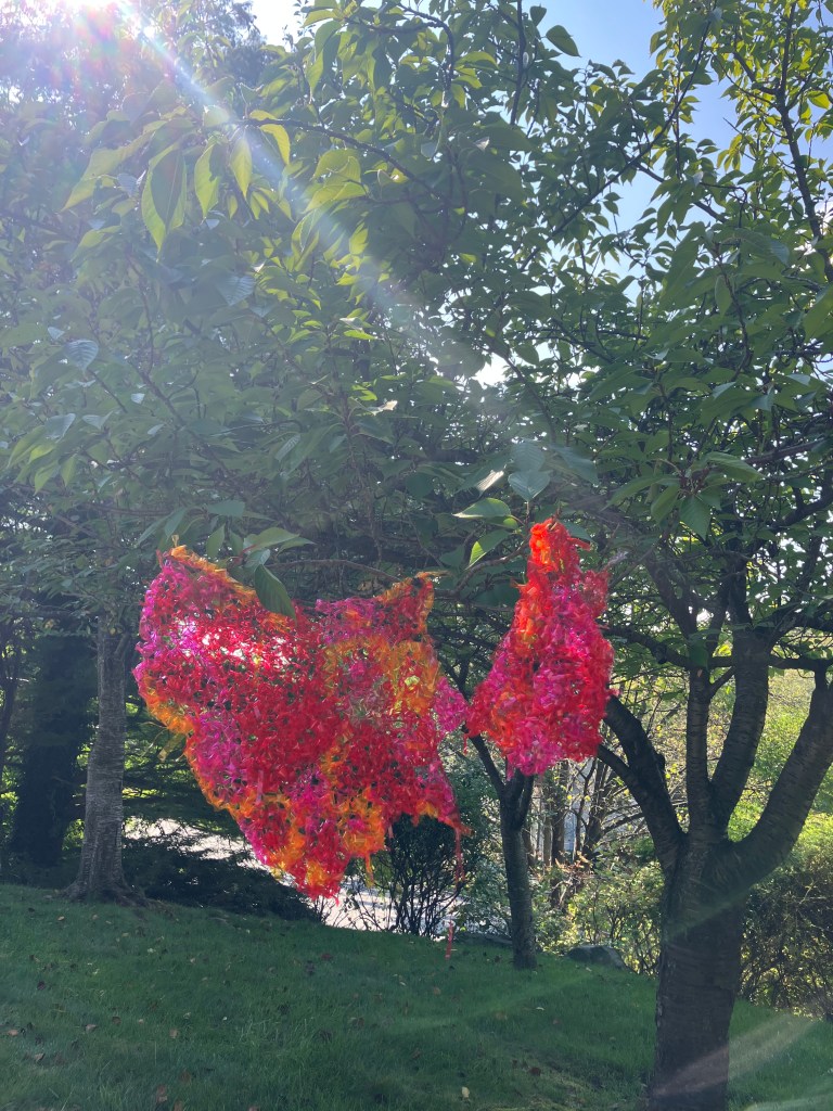 Using the piece’s vibrant color and transparency as a point of initial interest, Amalya Meira noticed garden creatures were simliarly drawn to the piece while weaving it. In experimenting with weaving non-organic, discarded vinyl, Dayglo Passrelates the non-natural into something that almost looks at home in the natural world- if not a heightened, engaged version of environment and human waste. Citing naturally occurring textures and shapes while also honoring how the vinyl wanted to behave in the weaving process, Dayglo Pass was made in NYC parks with stop overs from bees & butterflies throughout its making. “I wondered how it might be to look out of this glowing tunnel?” “Or maybe [see] a colored shadow if we’re lucky…”