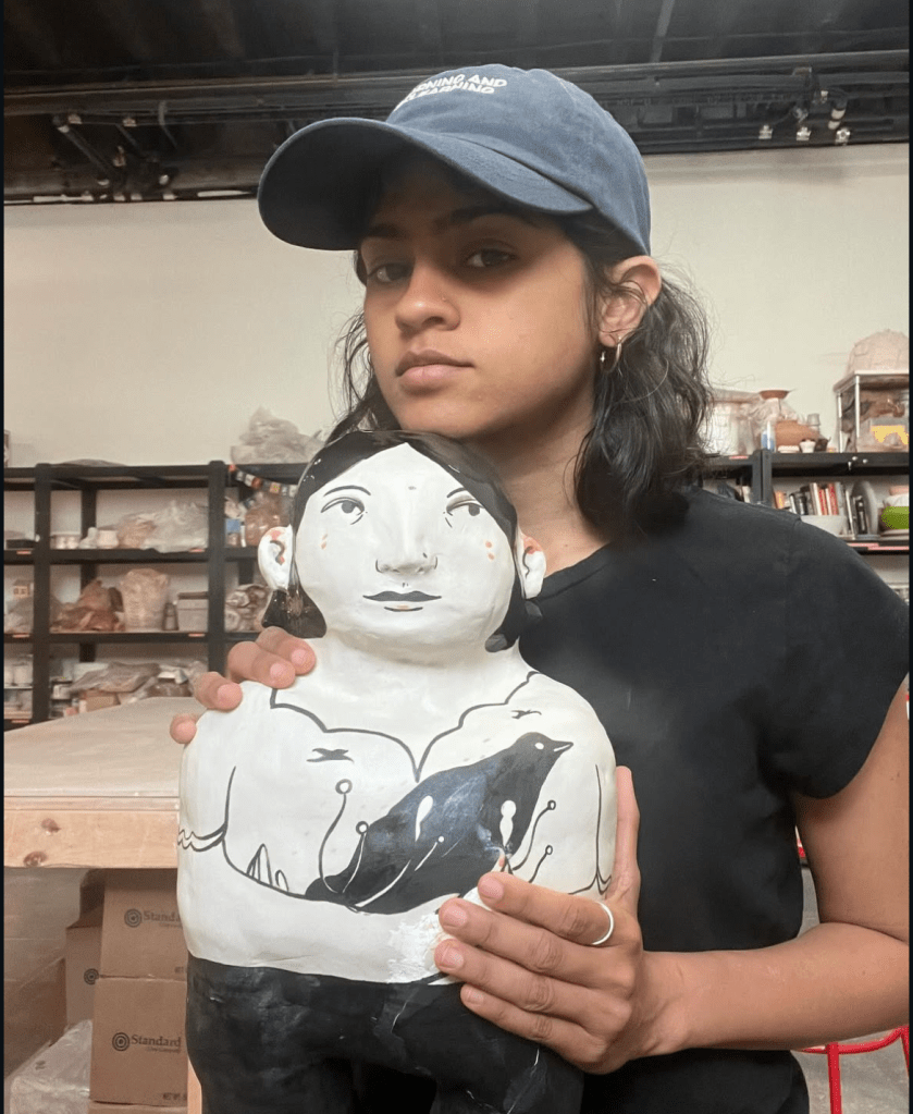 Kiran Joan created this piece during her residency at Watershed in Maine. Lady with crow becomes a playground for experimentation and a space where the inner world openly reflects and converses with the outer. During the piece’s conception Joan was between Baltimore and New York, inspiring a sense that the lady is searching for freedom, openness, and light. The piece holds the energy of exploration, change, and possibility in the shifting protagonist of crow and lady- sculpting a more harmonious path of what future relationships with nature and the self may look like.